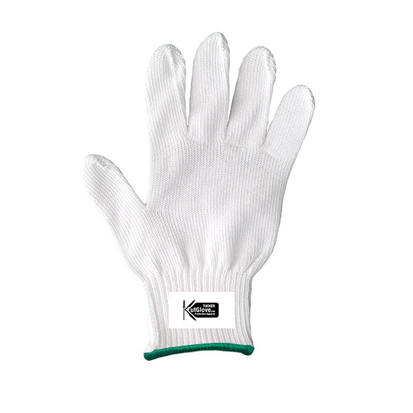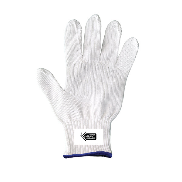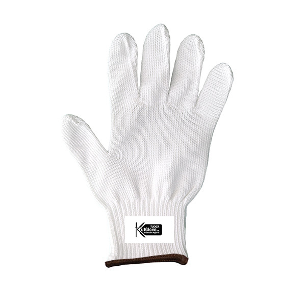 White KutGlove™ Cut Resistant Glove, 10 Gauge, Dyneema yarn; Designed to ensure fingers go all the way to the tip of the glove for touch sensitivity and dexterity. Can be effectively washed and sanitized multiple times; bleach and sanitizer safe.